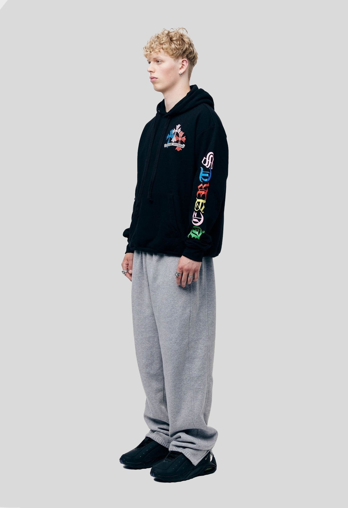 This hoodie is made of heavyweight, incredibly soft cotton and fits loosely for comfortable wear all day. The brand’s recognizable gothic lettering and cross motifs are featured in the multicolored graphics, which are skillfully printed on the chest, back, and sleeves to produce a striking contrast with the basic fabric. Chrome Hearts distinctive rebellious spirit and painstaking attention to detail are evident in every detail.